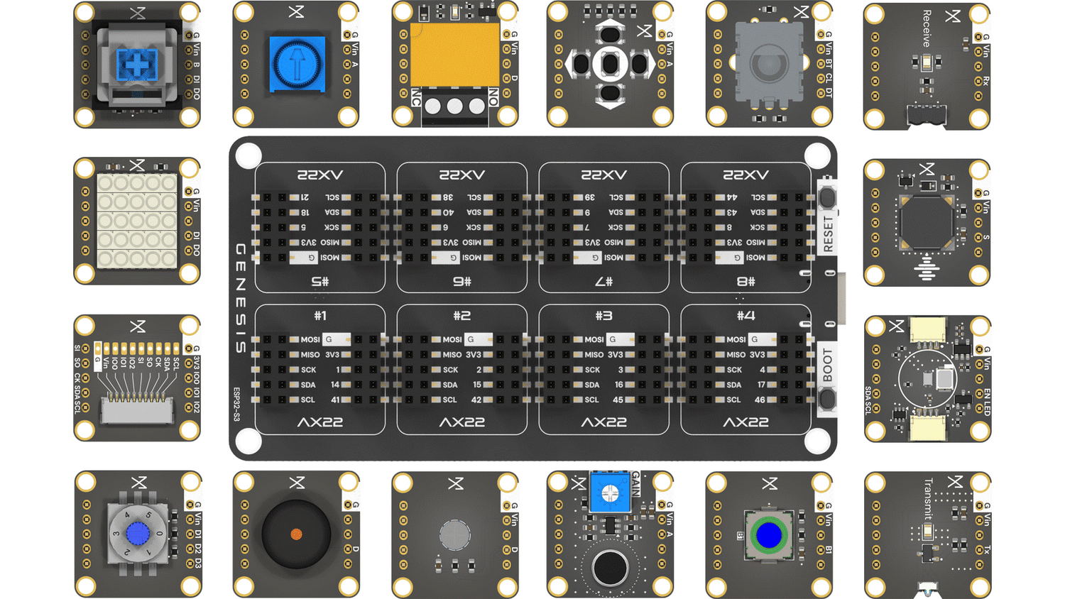 Genesis is one result of this thinking. It brings eight AX22 ports together on a single board. But the real idea is the port itself. My hope is that people will add AX22 ports to their own PCBs. I do this myself all the time. I love prototyping, and now I can drop a pair of headers onto a board and plug in whatever module I need. It feels natural and convenient.