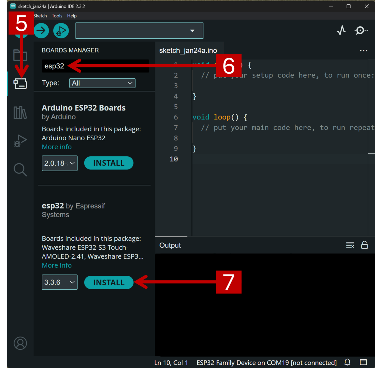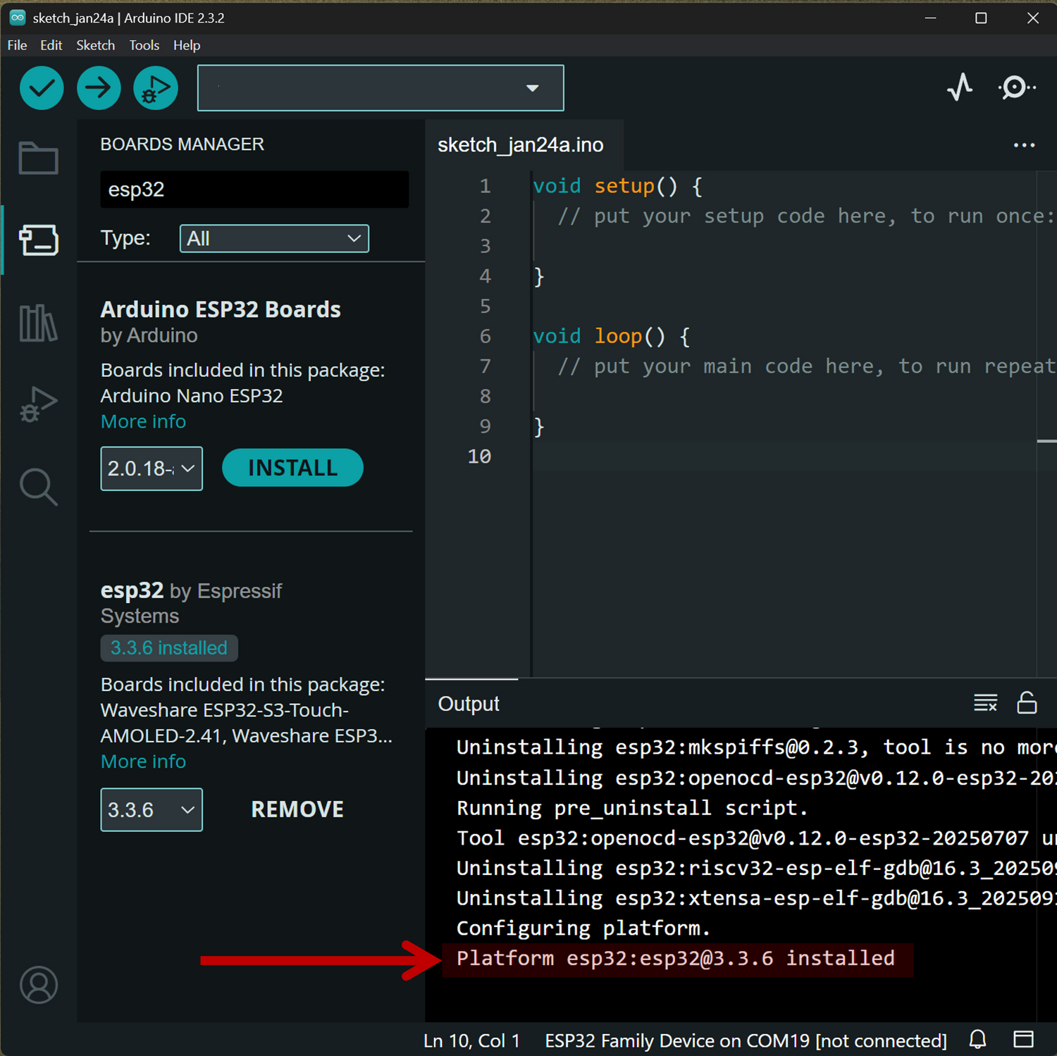 This can take some time, wait until installed and you see a message in the output black box (something like: Platform esp32:esp32@3.3.0 installed)