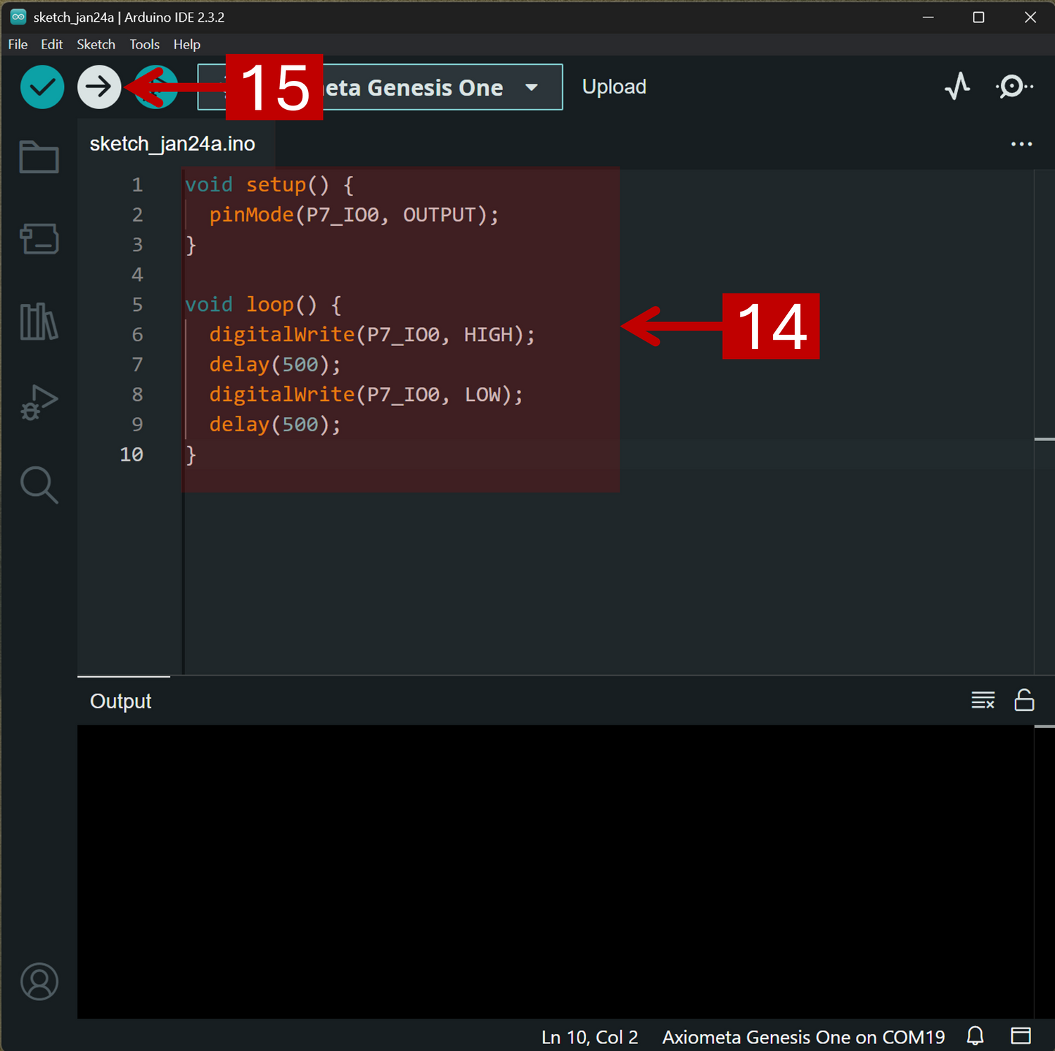The GENESIS One Arduino Library has all the pin definitions built in, so controlling the LED is straightforward