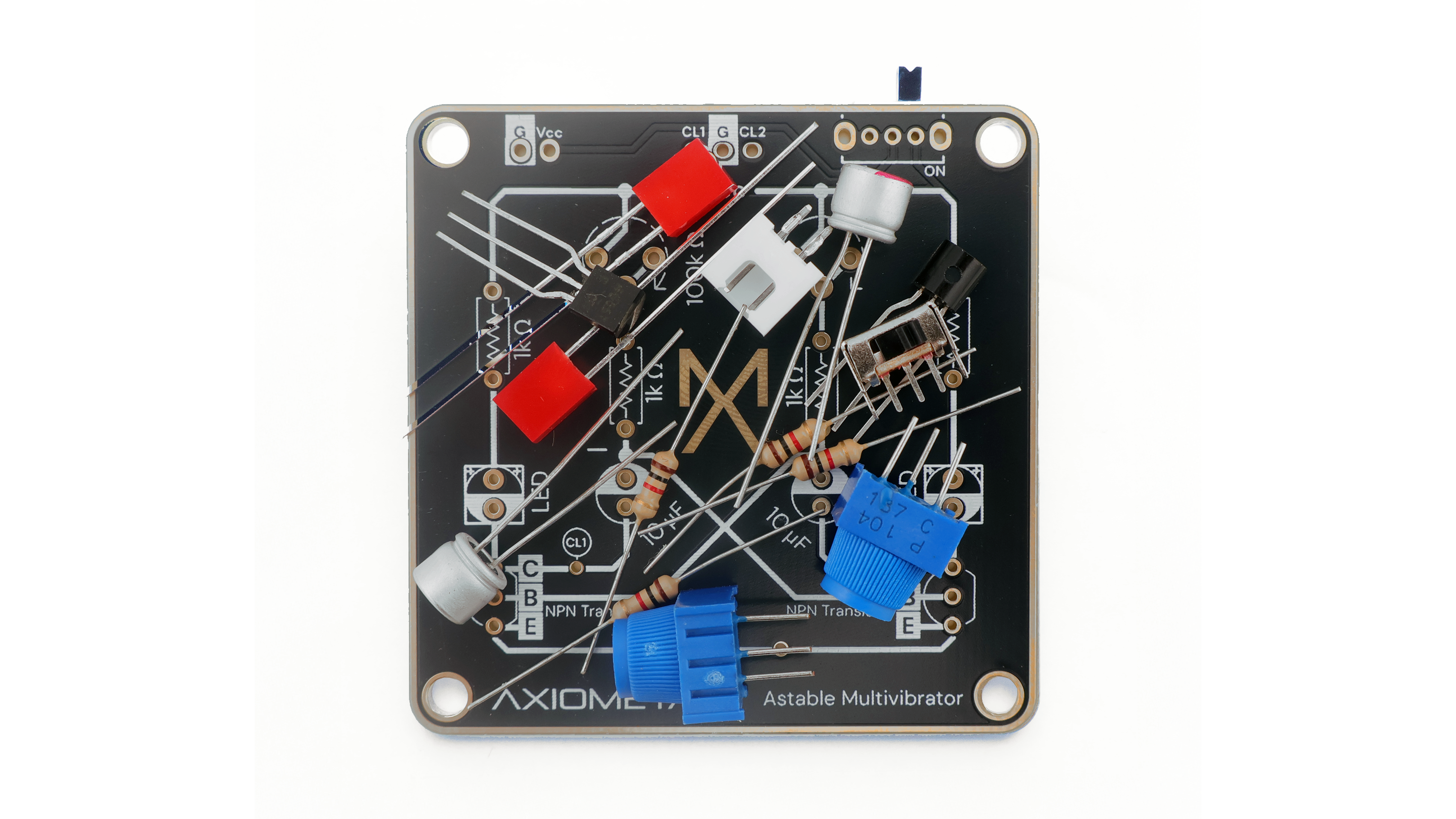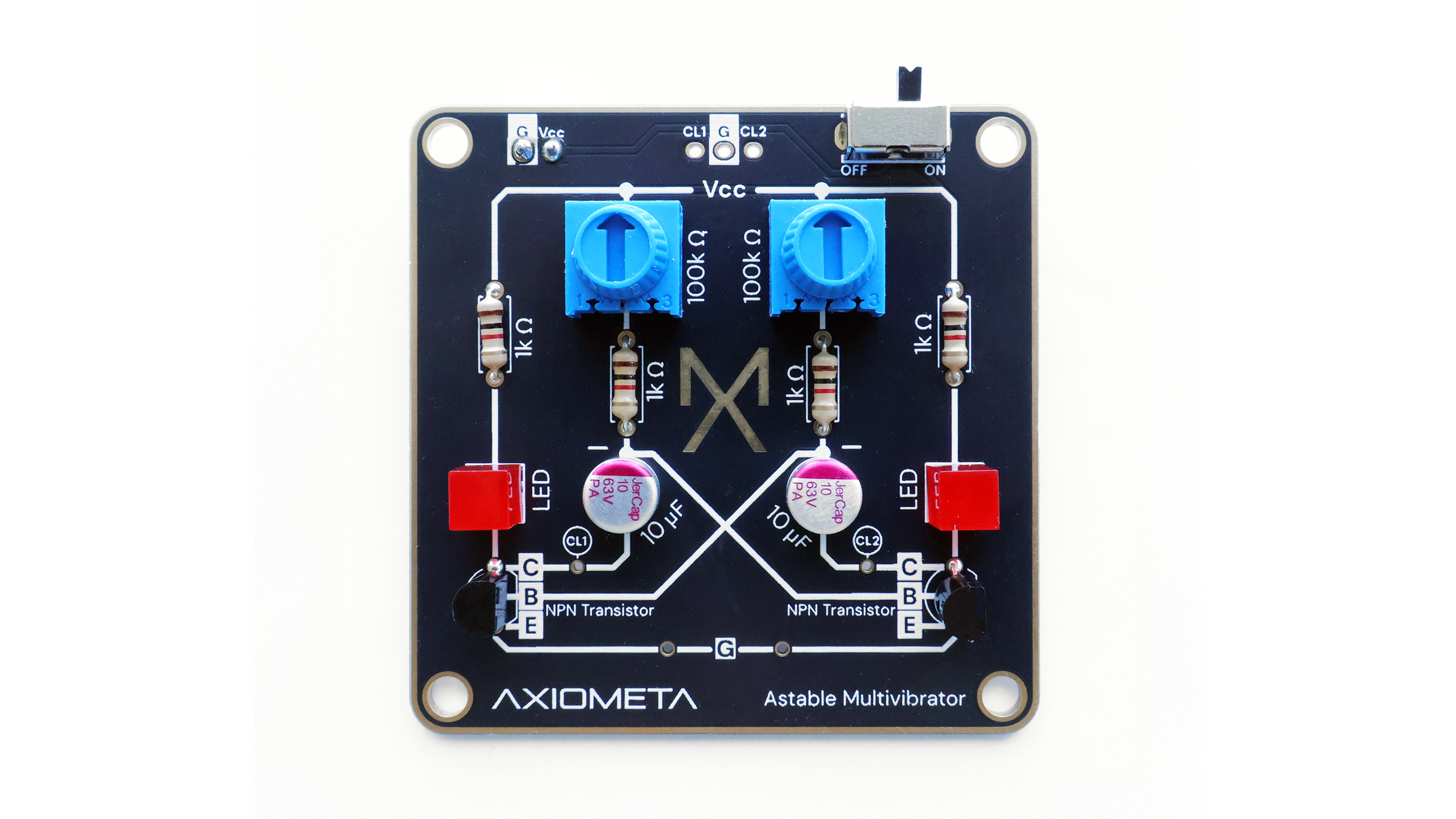 The Astable Vibrometer is a hands-on soldering project designed to demonstrate how alternating signals are generated using a flip-flop configuration. Two LEDs visualize the oscillation, switching back and forth in rhythm with the circuit’s timing.