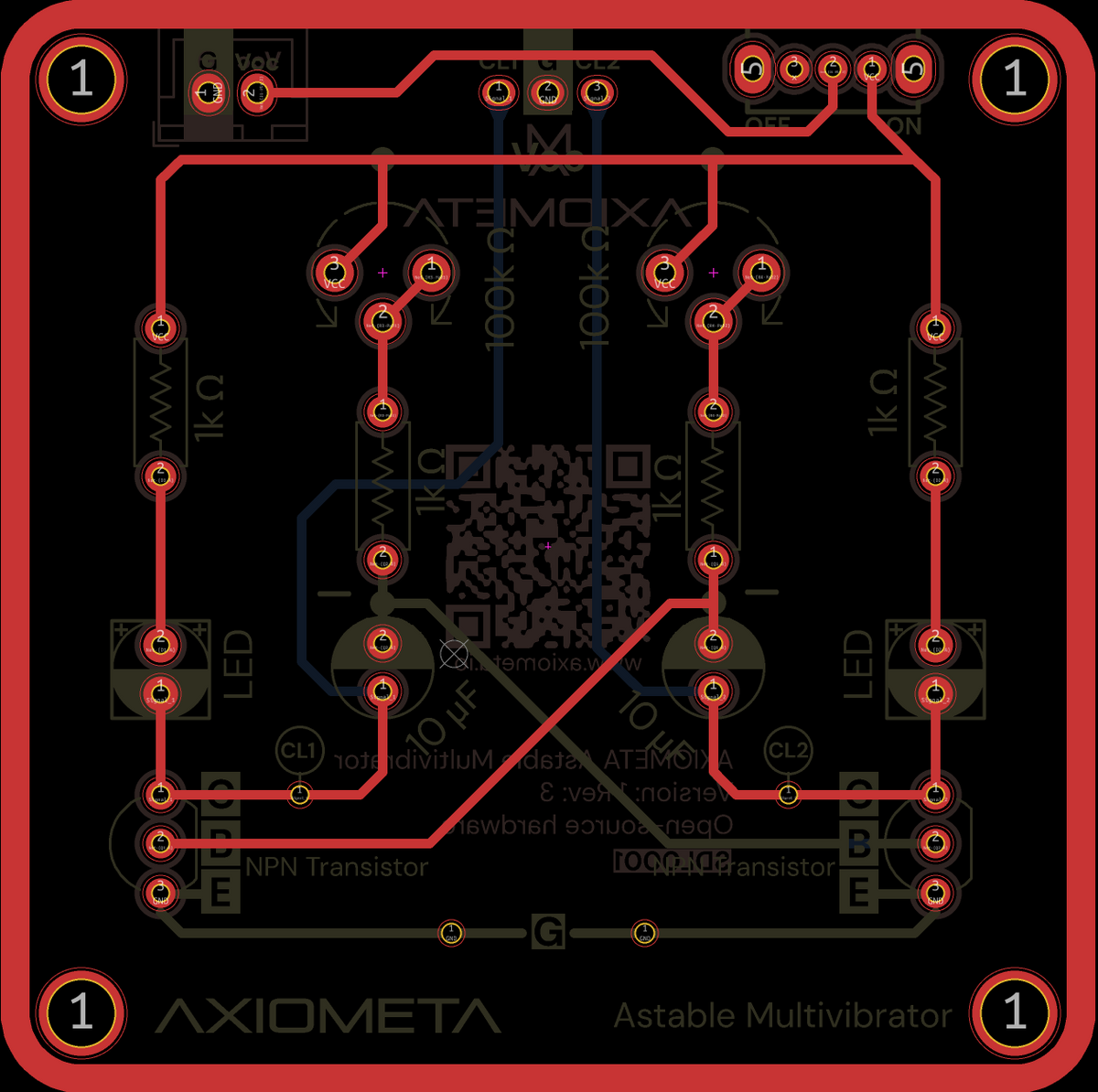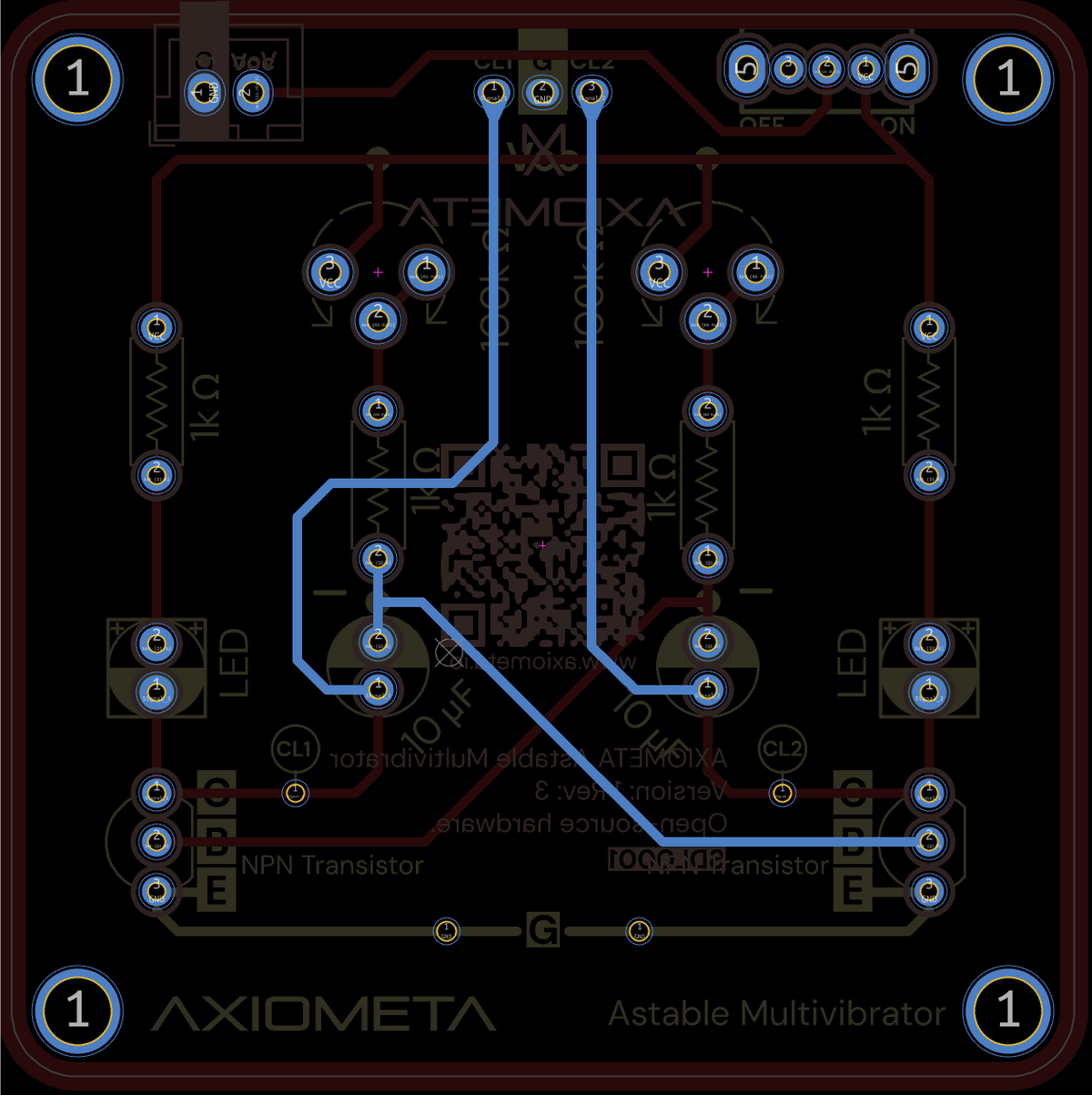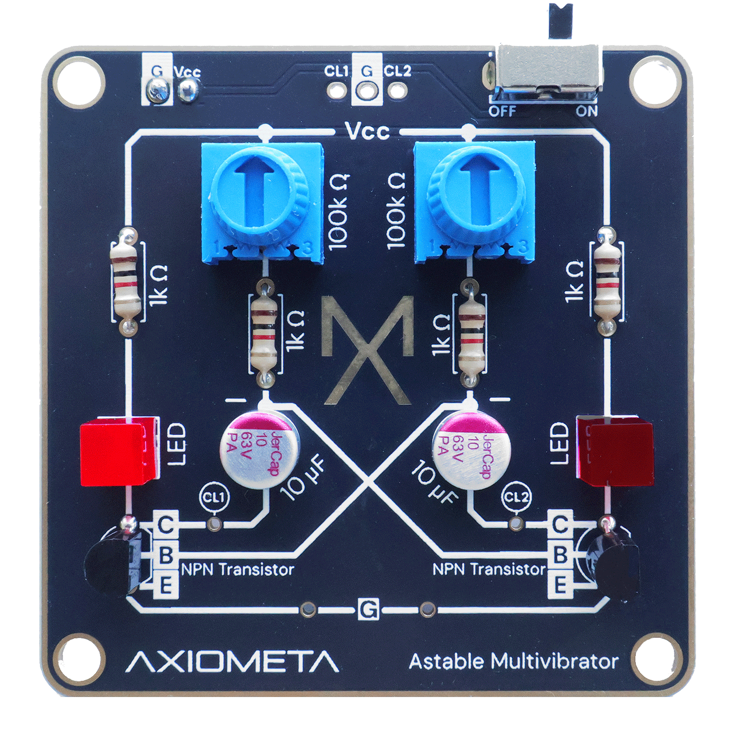 The circuit generates a repeating on/off signal a simple oscillator known as an astable multivibrator. As it runs, two LEDs blink back and forth, showing how a pair of transistors and capacitors work together to create timing and rhythm in electronics.