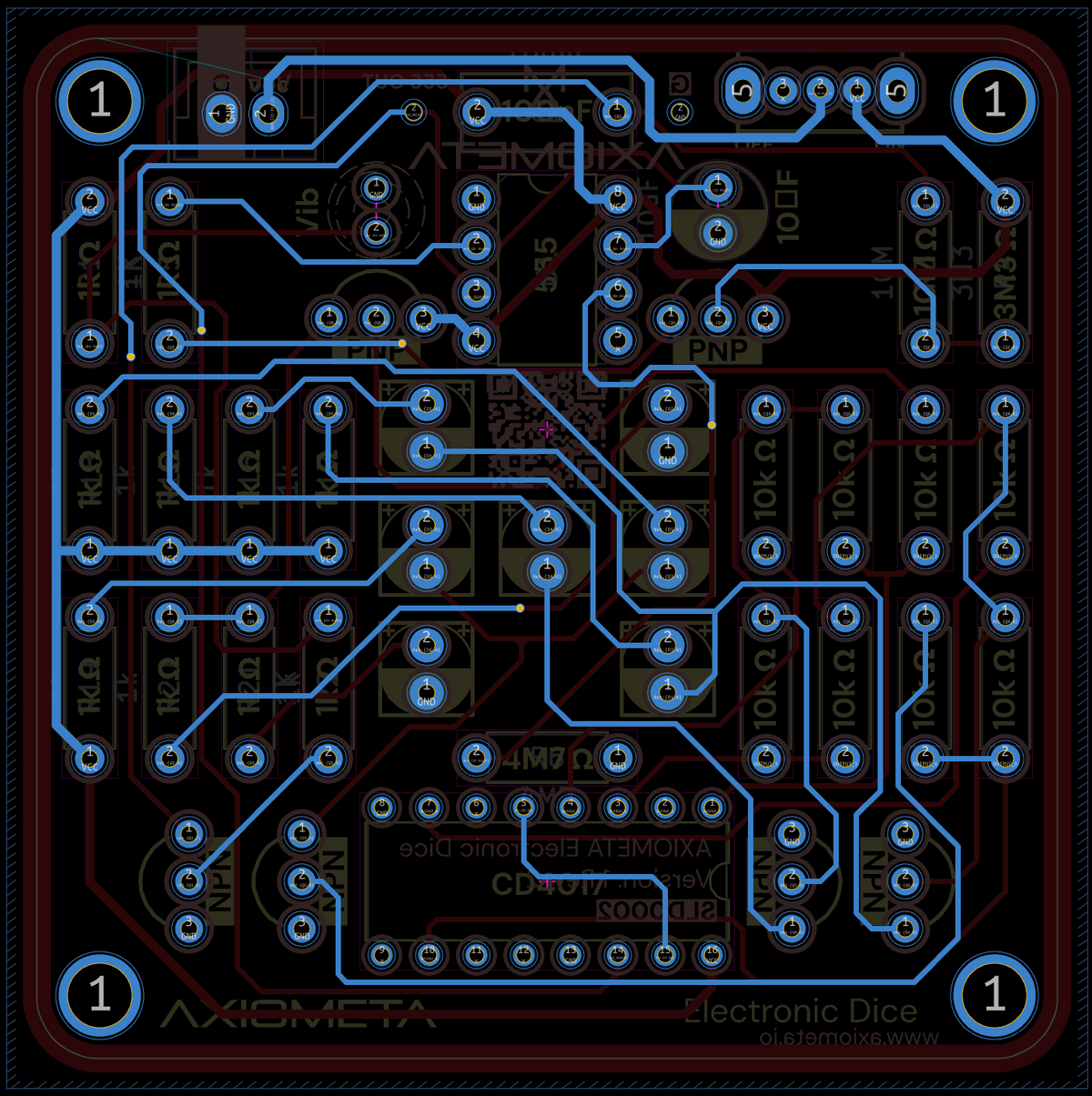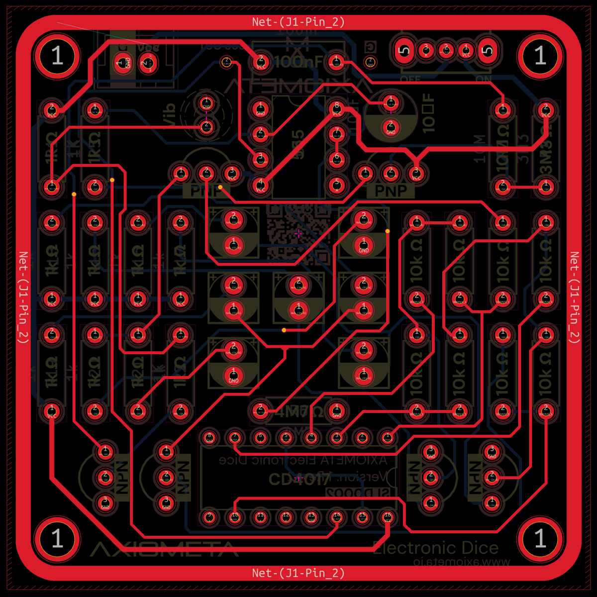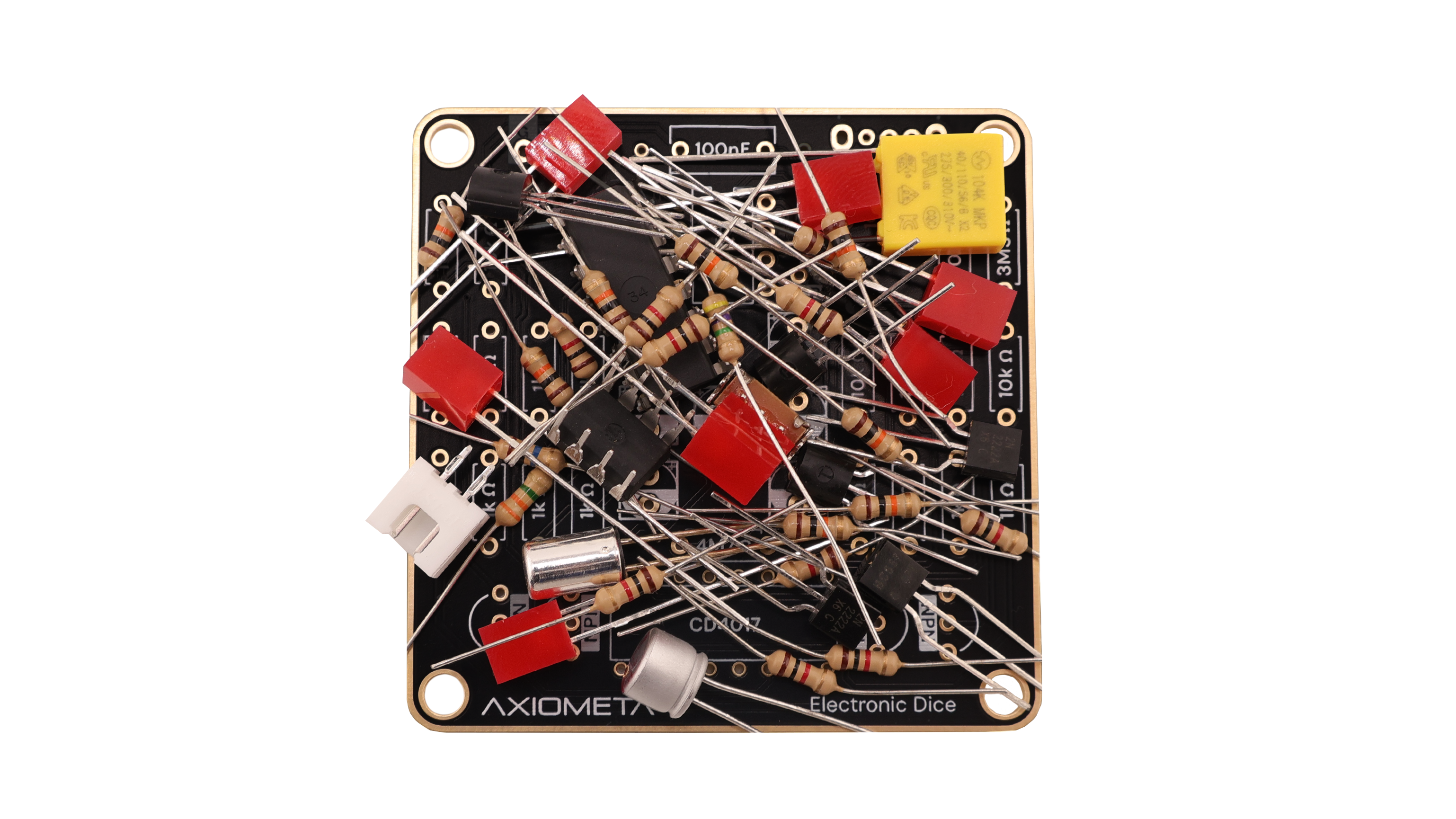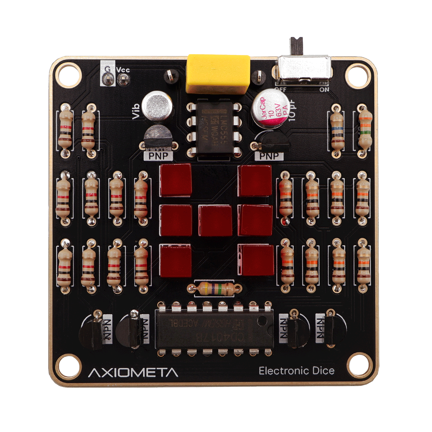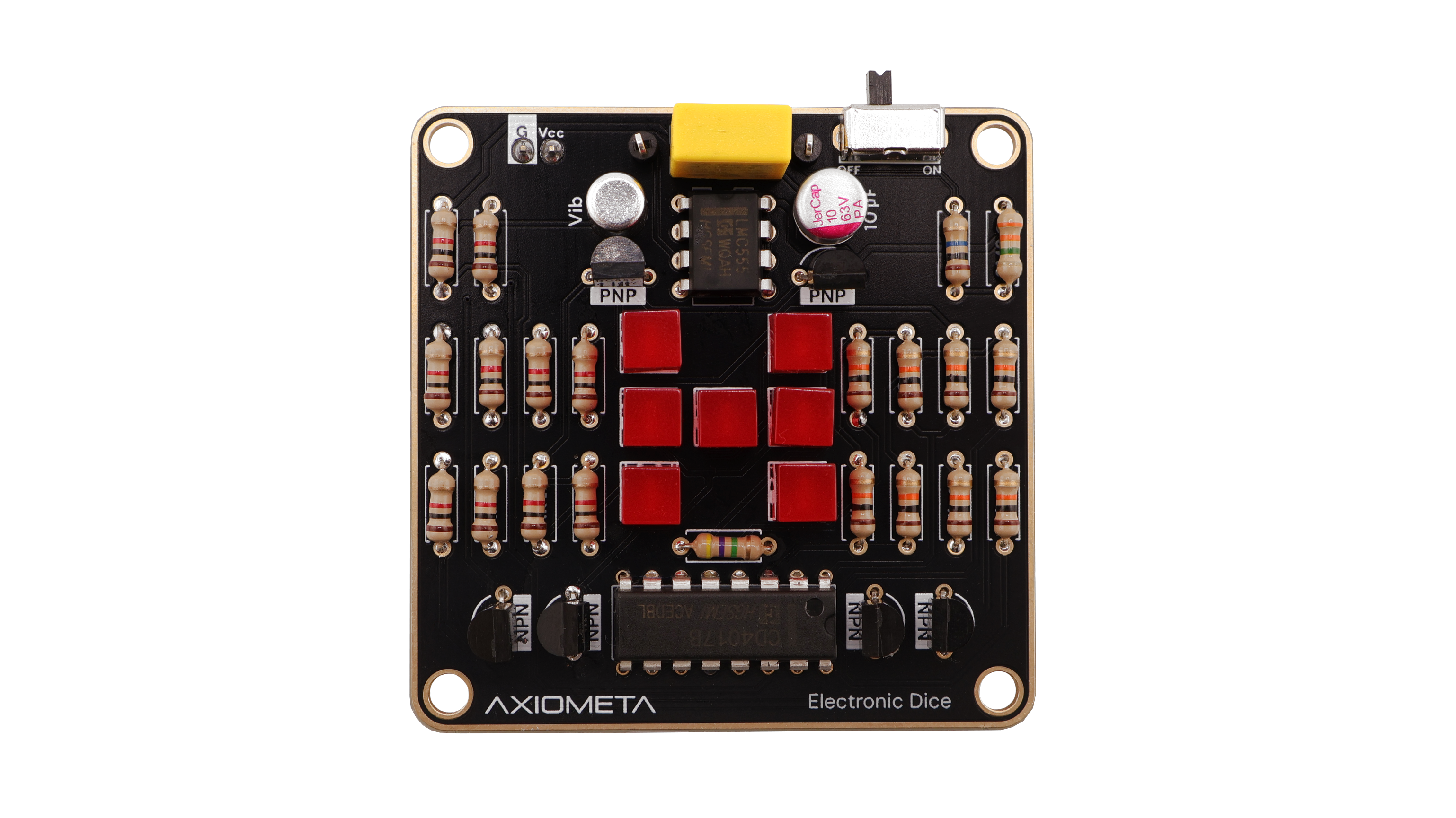 The Electronic Dice is a hands-on soldering project designed to demonstrate how random number generation works using digital logic. When shaken, a tilt switch activates a 555 timer that rapidly cycles through a CD4017 decade counter. As the oscillation slows, LEDs illuminate in sequence before landing on a final dice face, visualizing how timing circuits create unpredictable outcomes from deterministic components.